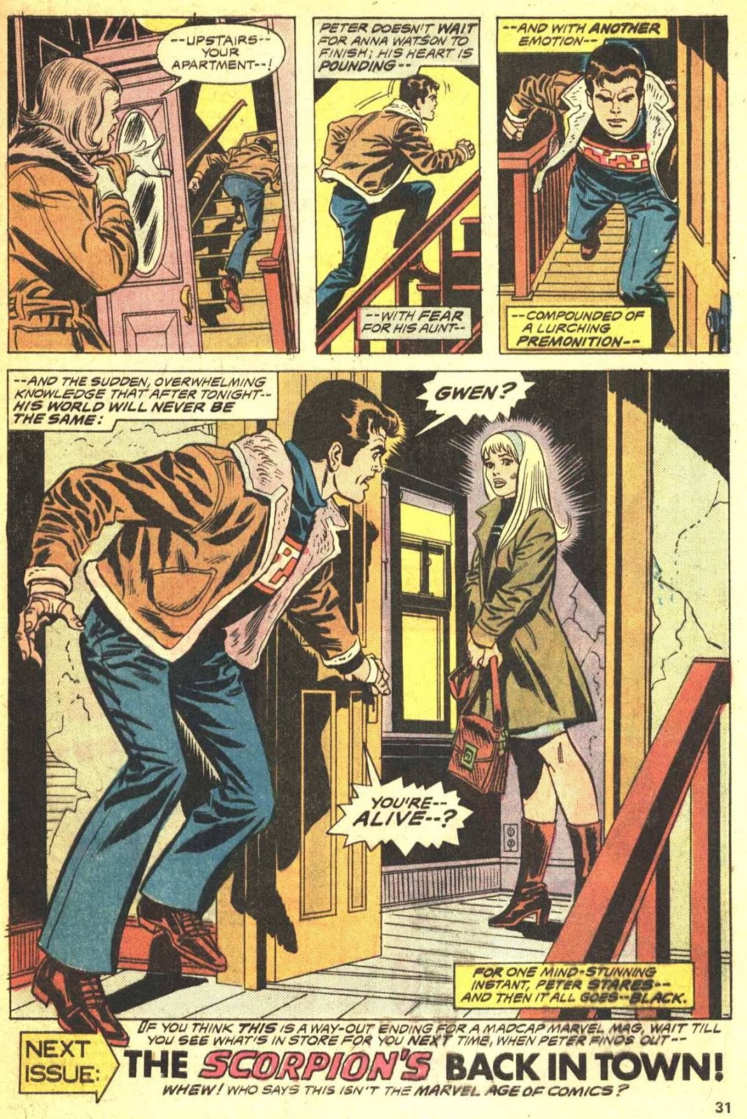 Peter, Joe y Jameson regresan a Nueva York, cuando Peter llega a su apartamento se encuentra con Anna Watson que le dice que su tía May está en el hospital de la impresión que había sufrido al ver a Gwen, Peter sube a su piso y se encuentra con el clon de Gwen Stacy.
