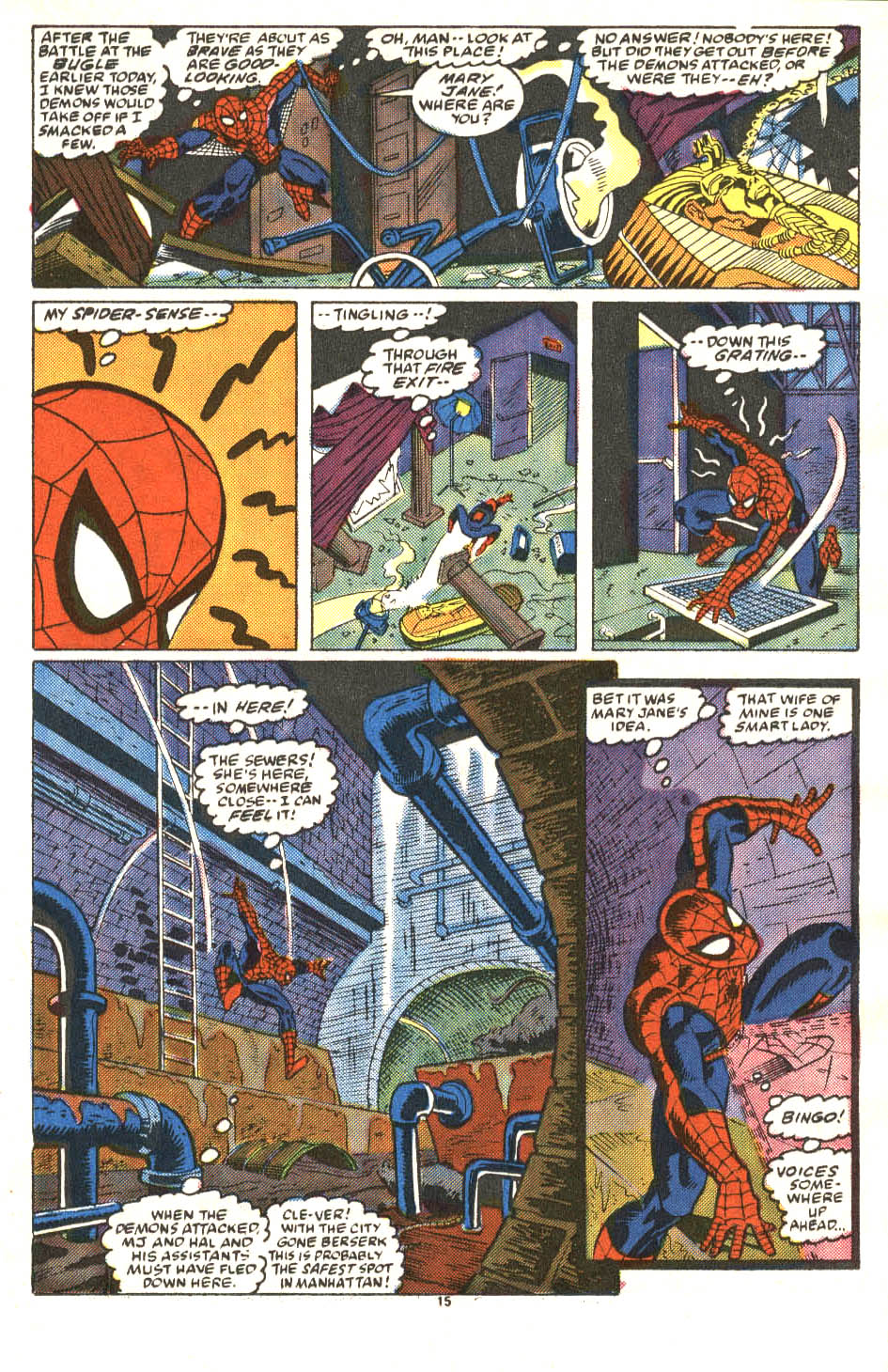 En este número Spiderman aturdido tras la pelea en el Bugle alucina viendo a Jameson y los demás como monstruos por lo que huye, una máquina cobra vida y ataca a Eduardo y Glory, Eduardo acaba con la máquina y besa a Glory, los monstruos atacan el cuartel general de Kingpin, tras ser derrotados por Kingpin el rey del hampa le pide al Arreglador que arregle lo que está sucediendo para así poder seguir con su venganza personal contra Daredevil, Macendale ve al Lagarto y lo confunde con uno de los monstruos de Inferno, Spiderman va en busca de Mary Jane que se ha refugiado con sus compañeros de trabajo en las alcantarillas, Harry va a ver a la tía May que está con Kristy y ve que ambas están bien, Macendale encuentra a Spiderman y ambos se enfrentan, el villano usa sus nuevos poderes contra el héroe, peleando terminan encontrándose con Mary Jane y sus compañeros, Mary Jane rompe su vestido y le prende fuego arrojándoselo a Macendale para salvar a Spiderman, Spiderman rescata a Mary Jane y sus compañeros de las alcantarillas, Spiderman cree que la pesadilla de Inferno pronto terminará, el número concluye con que la tía May preocupada decide salir de casa para ir a buscar a Peter y Mary Jane.